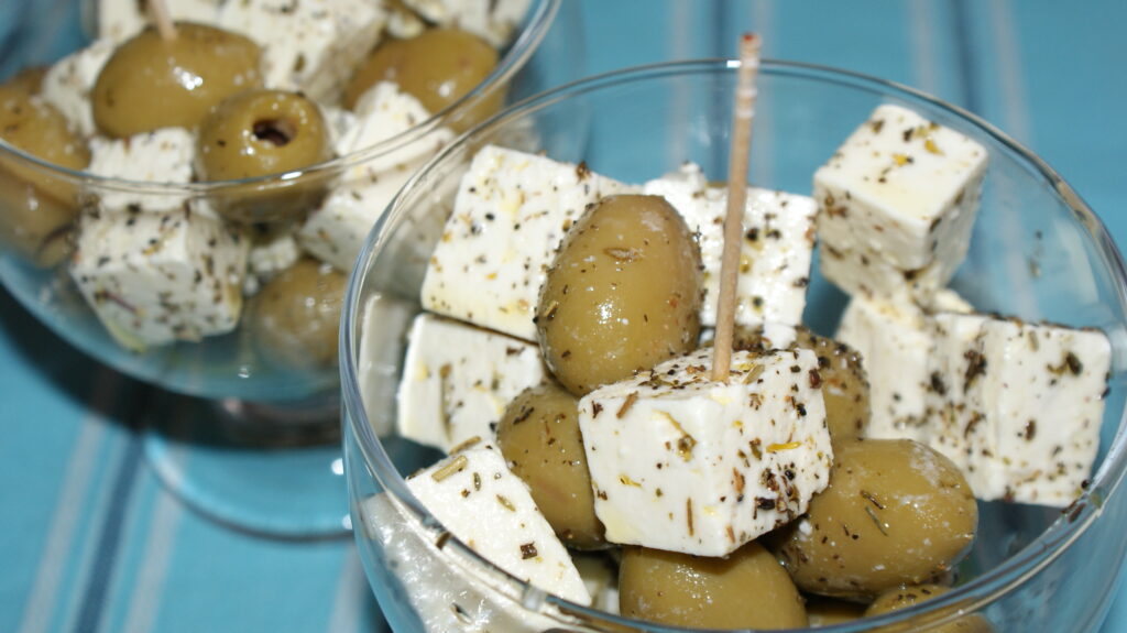 - Ser pokroić w 1 cm kostkę i przełożyć do miski razem z oliwkami