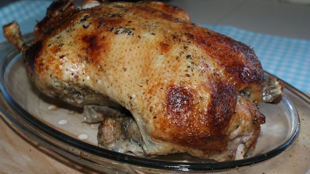 - Co pół godziny obracać kaczkę, a na pół godziny przed końcem pieczenia odlać nadmiar tłuszczu, ułożyć kaczkę piersiami do góry, zdjąć pokrywę i dogrzać piekarnik do 220 stopni C żeby mięso się ładnie zrumieniło