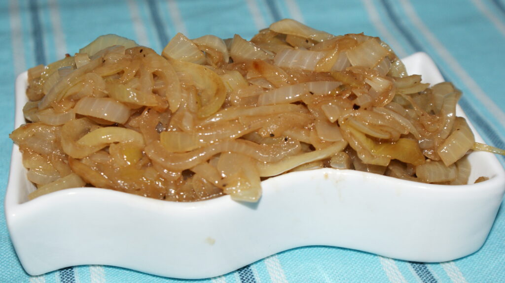 - Wrzucić na patelnię z roztopionym masłem i oliwą i smażyć na średnim ogniu co jakiś czas mieszjąc aż cebula będzie szklista (ok 20 minut)
