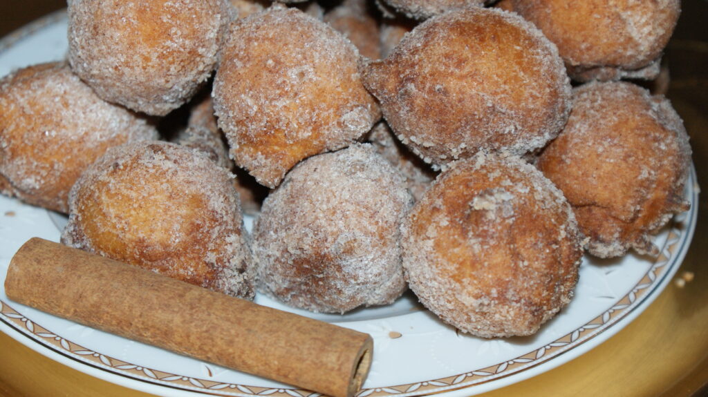 - Ciepłe pączki obtoczyć w mieszance cukru pudru, cukru waniliowego i cynamonu