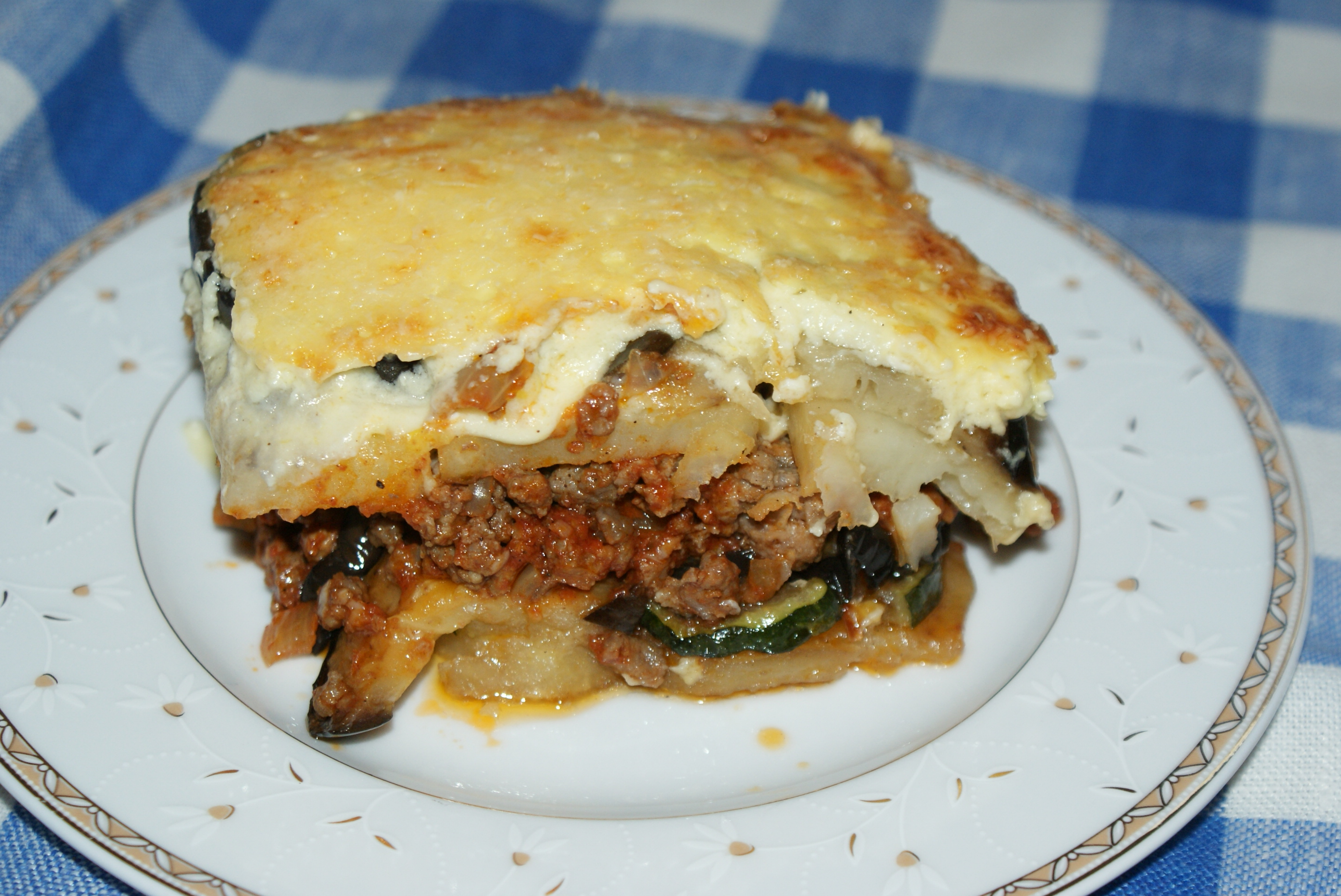 Musaka (mousaka, mussaka, moussaka) to jedno ze sztandarowych dań kuchni greckiej. Jest to zapiekanka na bazie ziemniaków, bakłażanów i mielonego mięsa pod beszamelem, którą można skosztować w każdej greckiej tawernie. W kwestii autentyczności przepisu polegam na kucharzach, którzy przyrządzali musakę w samej Grecji, czyli znających się na rzeczy. Przepis podpatrzony u Twardego Szparaga.