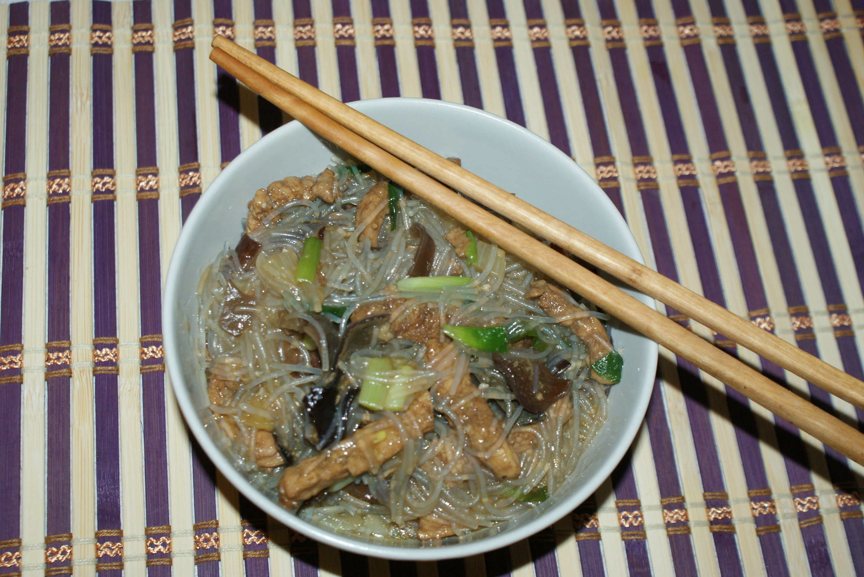 Tak jak większość dań kuchni azjatyckiej, ten makaron z wieprzowiną jest łatwy, szybki w przygotowaniu i bardzo smaczny. Może być bez kłopotu odgrzewany nawet kilka razy i zawsze smakuje równie dobrze. Przepis, nieco zmodyfikowany, pochodzi z książki “Kuchnia Azjatycka” Lindy Doeser.